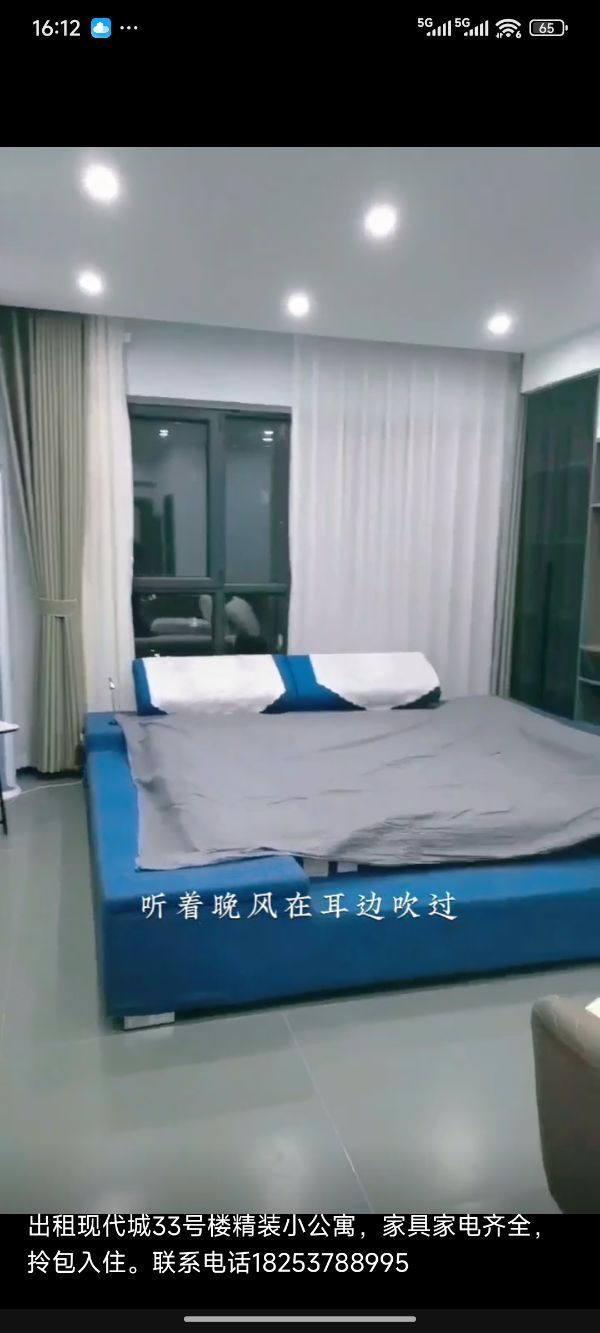 出租现代城33号楼精装公寓,全屋吊顶,边户,两面落地长窗,家具家电齐全,有立式空调,布艺大床,餐桌餐椅,沙发,冰箱,热水器,洗衣机,抽油烟机。寻不抽烟爱干净租户, 联系电话18253788995,微信同号。